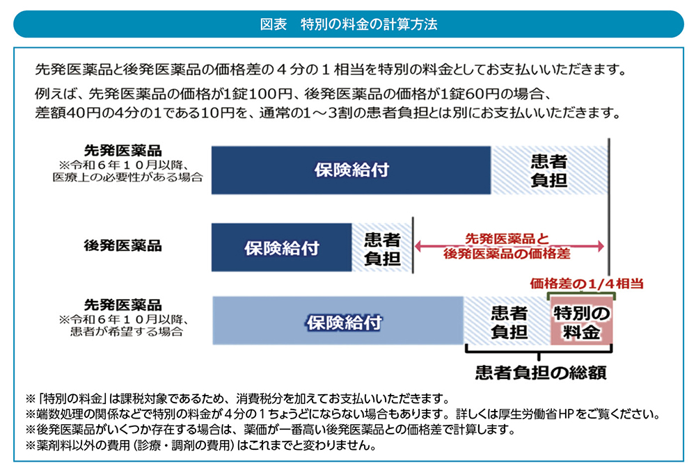 「令和6年10月から後発医薬品(ジェネリック医薬品)があるお薬で、先発医薬品の処方を希望される場合は、特別の料金をお支払いいただきます。」ということです。